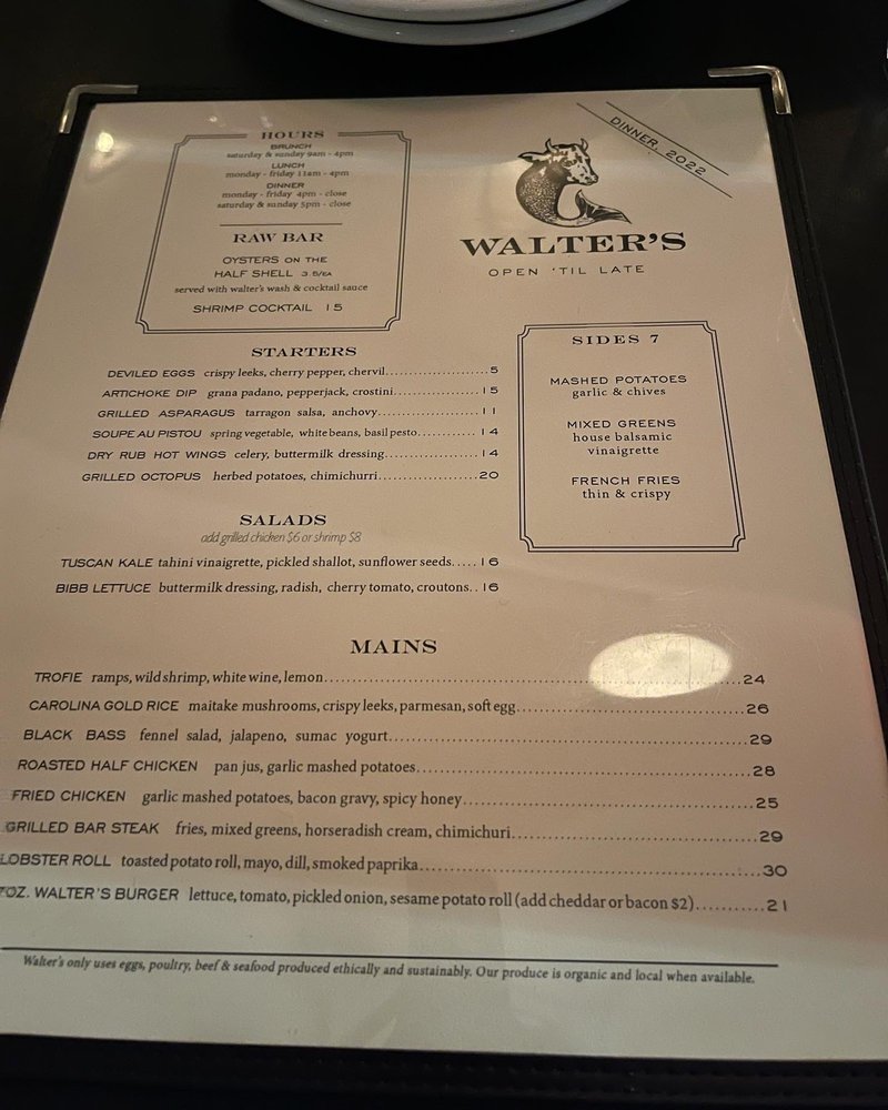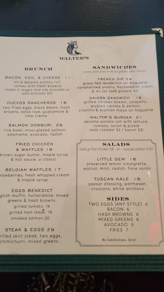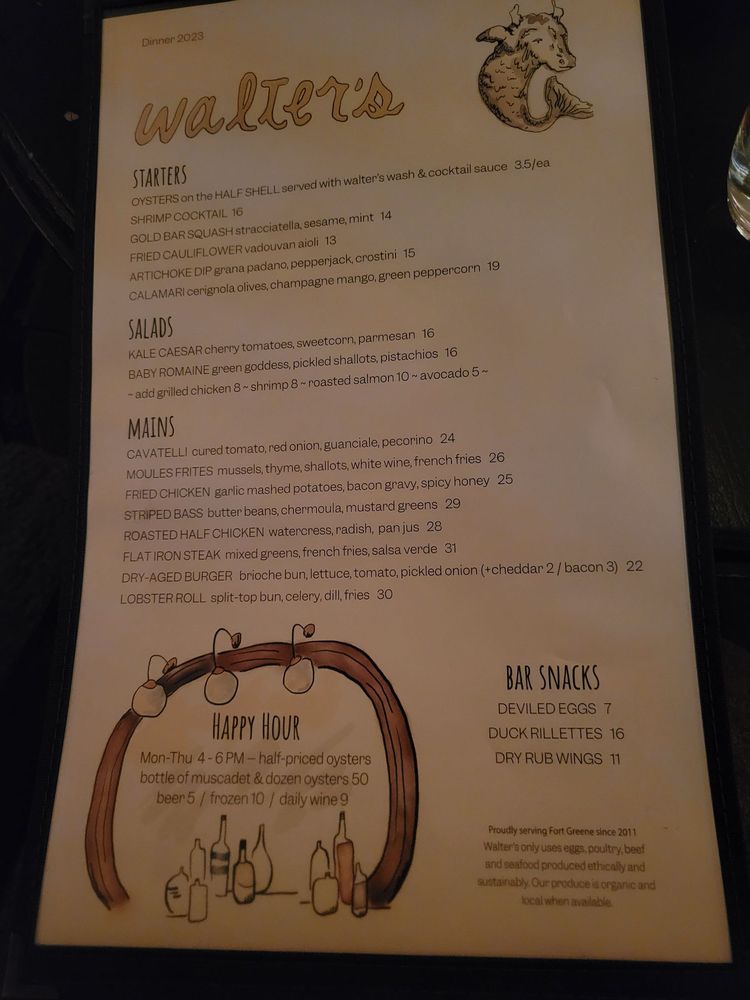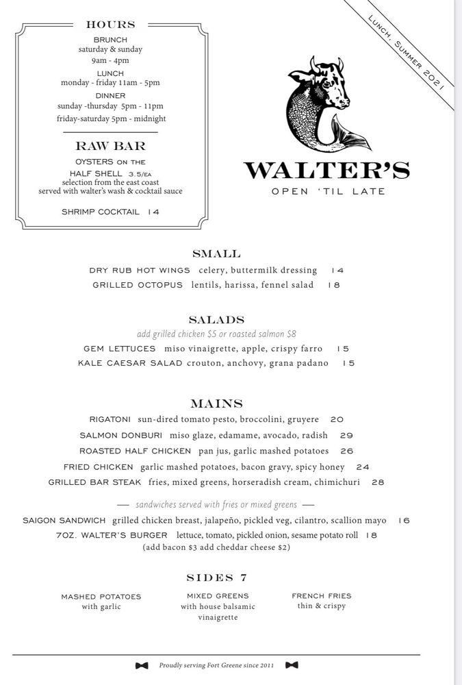 Walter's, located in Fort Greene, Brooklyn, is a popular spot offering a cozy and safe outdoor dining experience. The menu features delicious options like Gem Lettuce Salad, Kale Caesar Salad, Walter's Burger, Saigon Sandwich, Grilled Broccolini, Grilled Octopus, and Dry Rubbed Hot Wings. Customers rave about their French dip sandwich, oysters, deviled eggs, and key lime pie. The ambiance is praised for its great service, ambience, and awesome drinks like the espresso martini. Despite the long restroom lines, Walter's overall receives high ratings for its quality food and service. The extensive menu options, vegan choices, and accommodating amenities like full bar service, catering, and gender-neutral restrooms make Walter's a must-visit restaurant in Brooklyn.